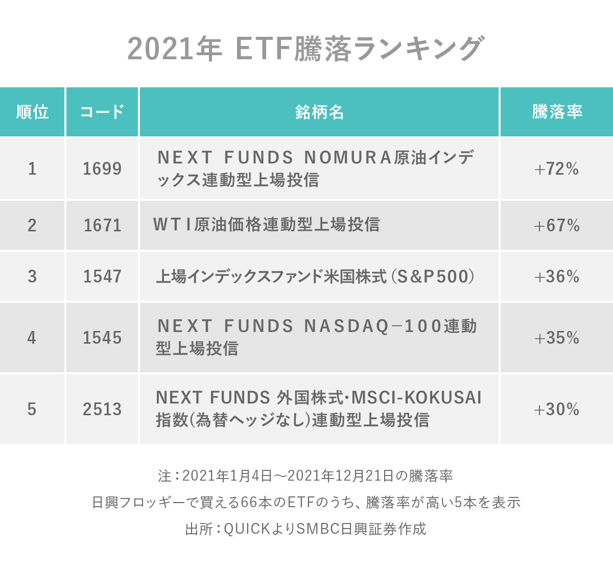 2021年に最も上昇したETFは、「 NEXT FUNDS NOMURA原油インデックス連動型上場投信 」でした(集計対象は日興フロッギーで買える66本)。また、2位にも原油価格に連動するETFがランクインしました。