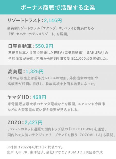過去最高の増加率! ボーナス商戦で活躍する企業 今週の銘柄トレンドWatch/ 日興フロッギー編集部 2022.06.26 6月はボーナス支給月。経団連によると、大手企業の夏のボーナスは前年比13.8%増と、1981年以降で過去最高の増加率だそうです!いつもより贅沢して、頑張って働く自分にご褒美をあげる人も多いのではないでしょうか。そこで今回は、リゾート宿泊施設や車など、ボーナス商戦で活躍する企業をご紹介します。 ボーナス商戦で活躍する企業: リゾートトラスト 、 日産自動車 、 高島屋 、 ヤマダHD 、 ZOZO