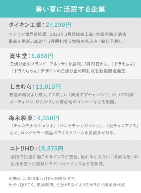 暑い夏に活躍する企業: ダイキン工業 、 資生堂 、 しまむら 、 森永製菓 、 ニトリホールディングス