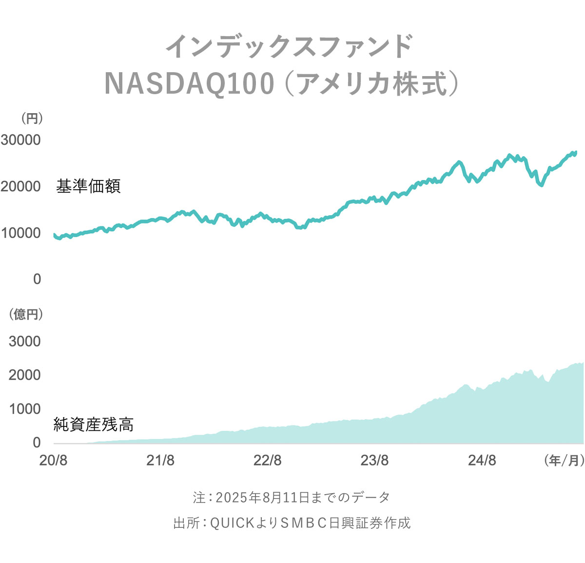 「 インデックスファンドNASDAQ100(アメリカ株式) 」は主として、「インデックス マザーファンド NASDAQ100」を通じて、米国の金融商品取引所に上場している株式などに投資します。「NASDAQ100指数(税引後配当込み、円換算ベース)」と連動する投資成果を目指して運用を行います。なお、資金動向等によっては組入比率を引き下げることもあり、原則、為替ヘッジはいたしません。