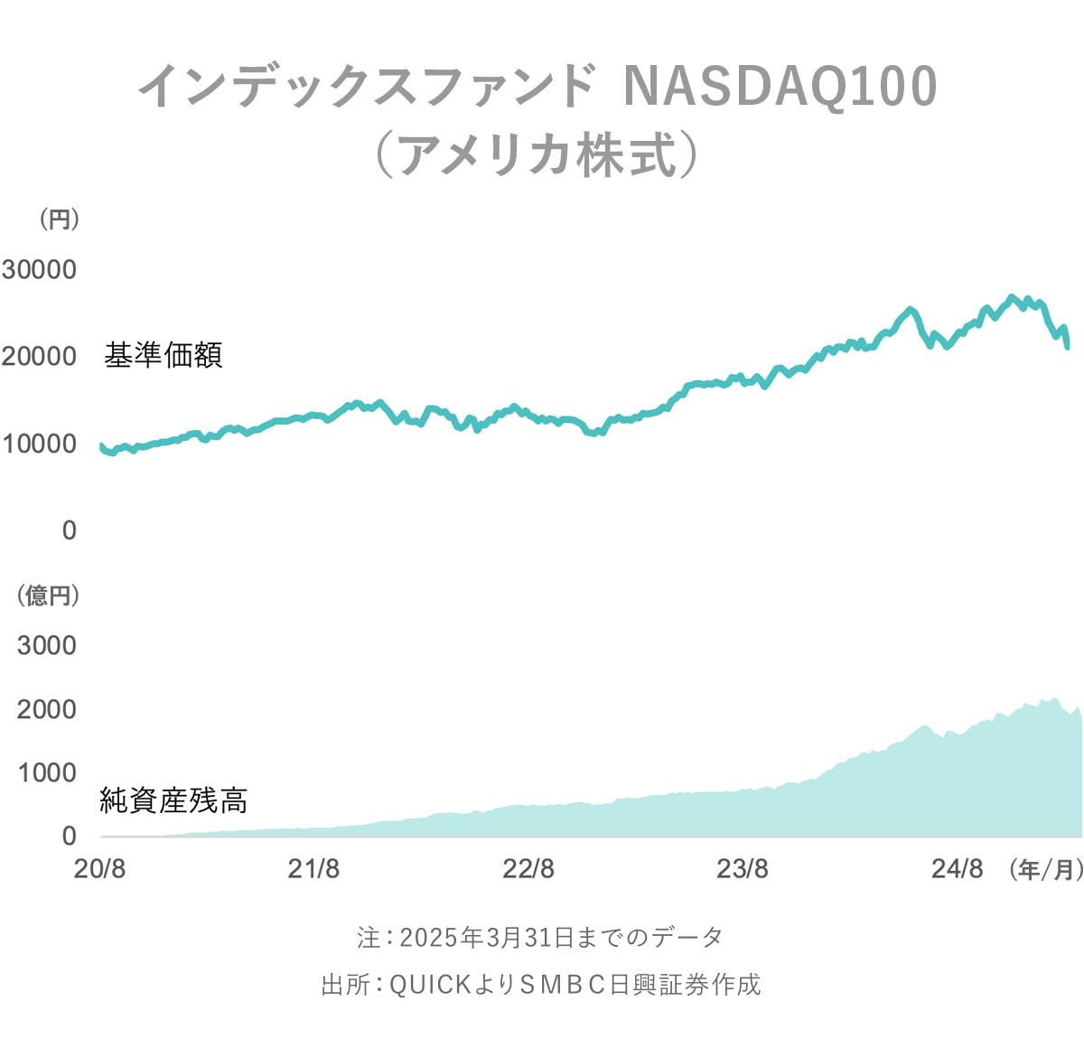 「 インデックスファンドNASDAQ100(アメリカ株式) 」は主として、「インデックス マザーファンド NASDAQ100」を通じて、米国の金融商品取引所に上場している株式などに投資します。「NASDAQ100指数(税引後配当込み、円換算ベース)」と連動する投資成果を目指して運用を行います。なお、資金動向等によっては組入比率を引き下げることもあり、原則、為替ヘッジはいたしません。
