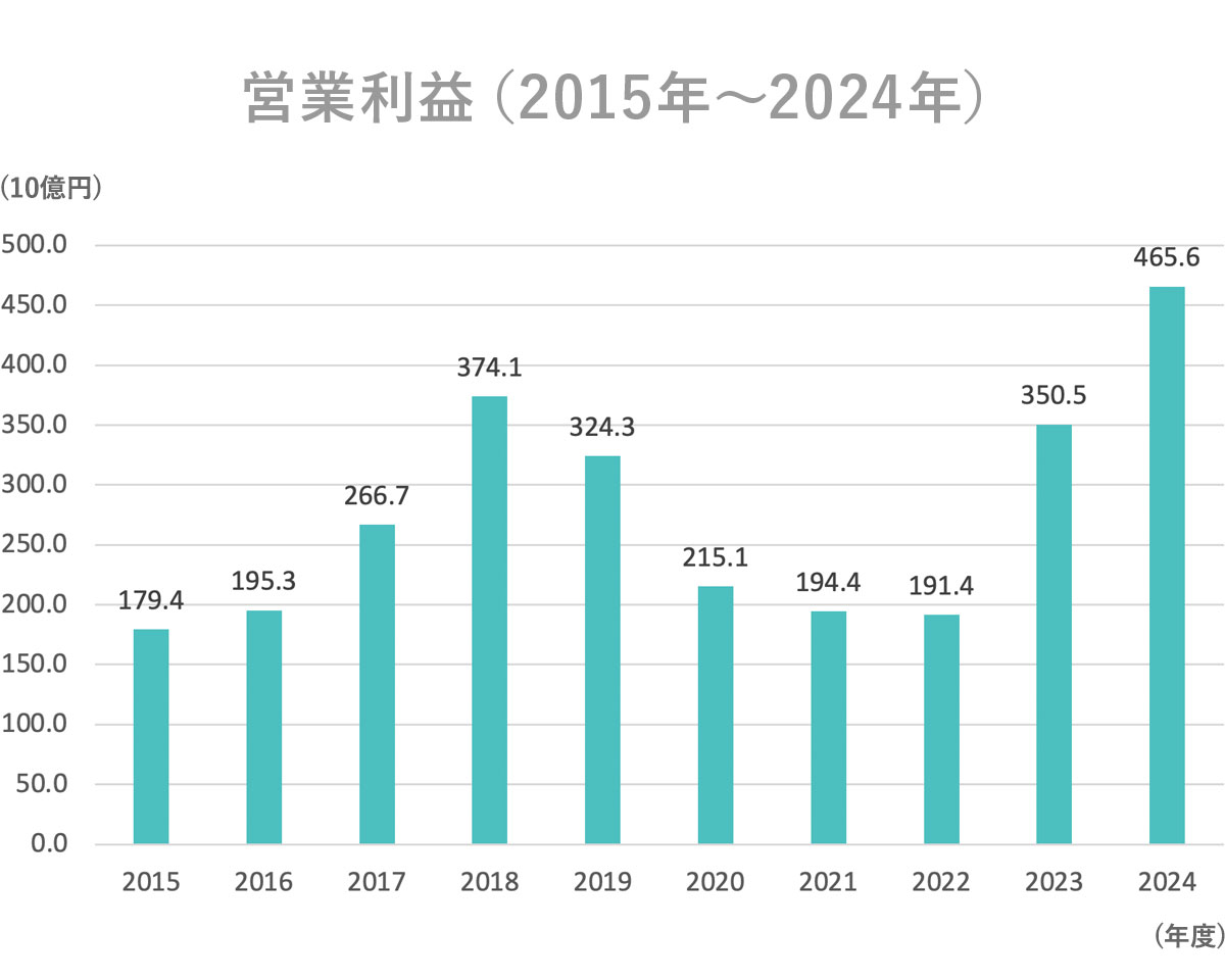 営業利益の推移は、2018年3月期までは成長が続いていますが、2019年3月期は若干の減益となり、そこからは2022年3月期まで大きく低迷しています。ですが、売上同様に2023年3月期以降は回復し、2024年3月期は過去最高を更新しています。コロナ禍での停滞から回復し、ここ2年間は好調です。