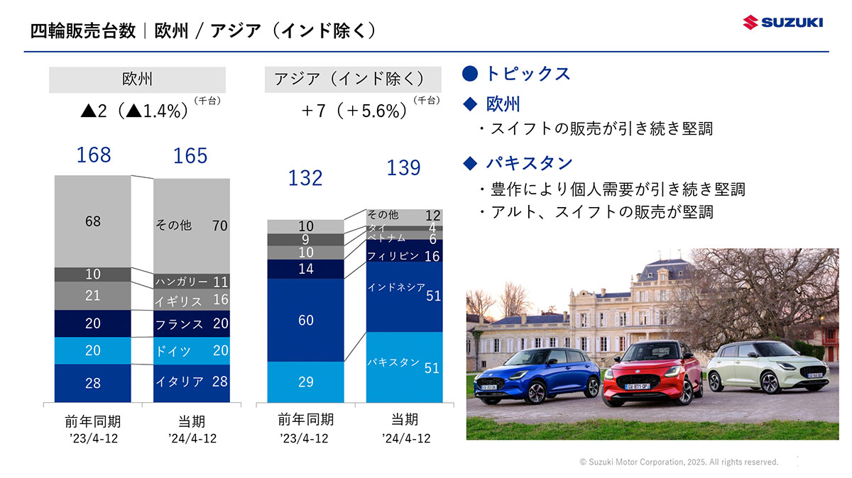 2024年3月期には日本市場でも、スペーシアカスタム、スイフトなどの上級グレード車が売れることによる好影響も出ています(2024年3月期決算説明会 P11参照)。