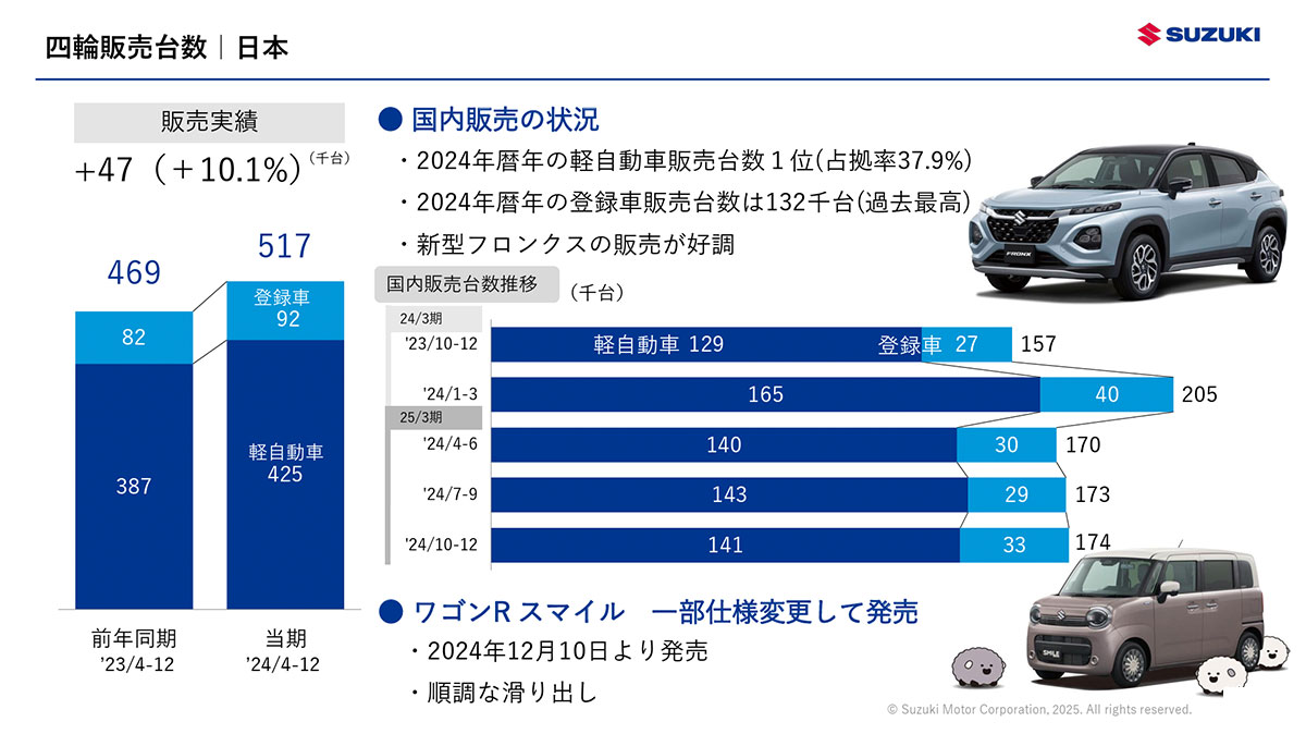 今回取り上げるのは、自動車やバイクメーカーとしてよく知られているスズキ株式会社です。国内では2024年の軽自動車販売台数が37.9%のシェアを持つトップの企業です(2025年3月期 第3四半期決算説明 P8参照)。