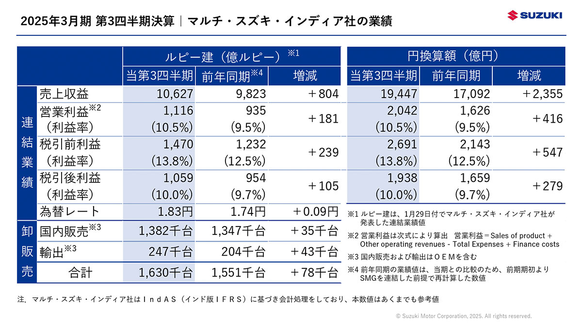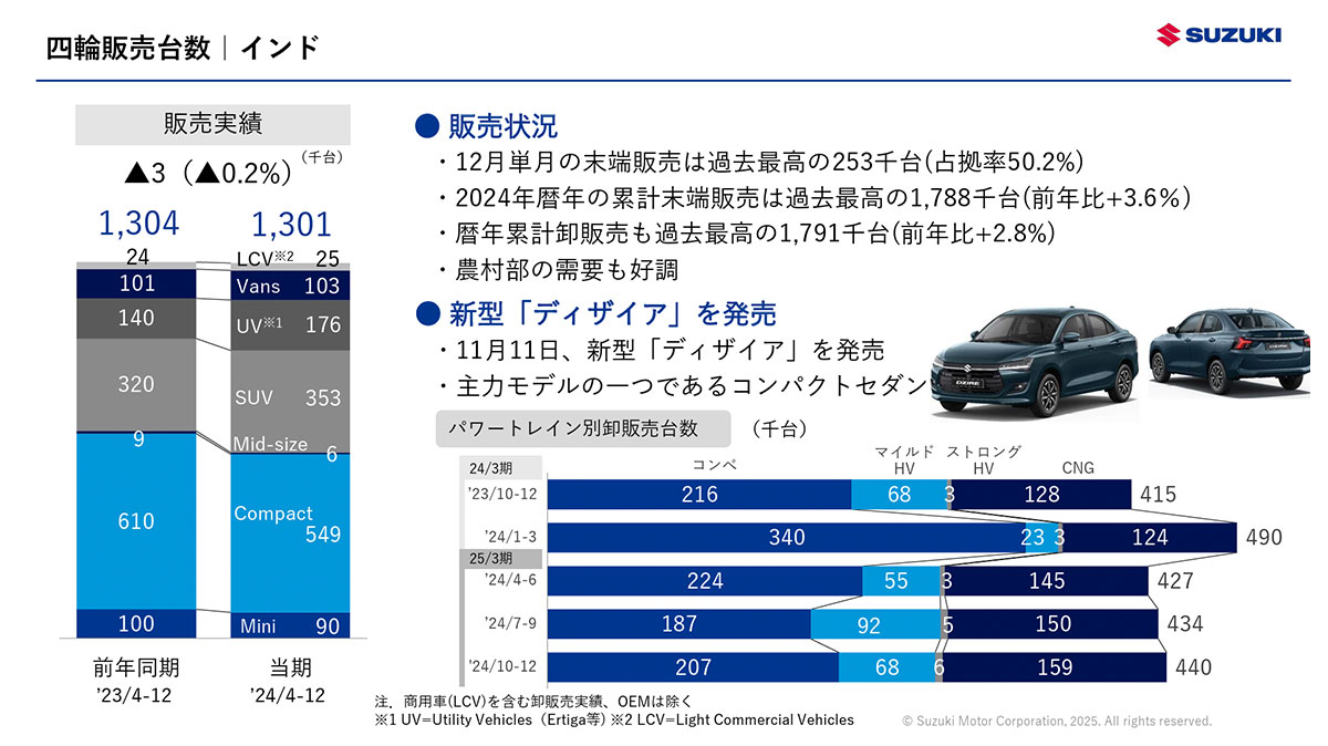 インドでは販売台数が減少し生産調整を行った時期もありましたが、マルチ・スズキは現地通貨建てでも業績自体は増収増益となっています。マルチ・スズキは輸出もしていますから、それによる好影響もあって、SUVの販売は拡大し、高付加価値製品の拡大による好調が続いていると考えられます。さらに、2024年12月に関してはインドの四輪車の販売台数は過去最高の25.3万台となり、市場占有率も50.2%と大きく伸びて好調です。市況の改善が進むことで、今後も好調が期待できそうです。