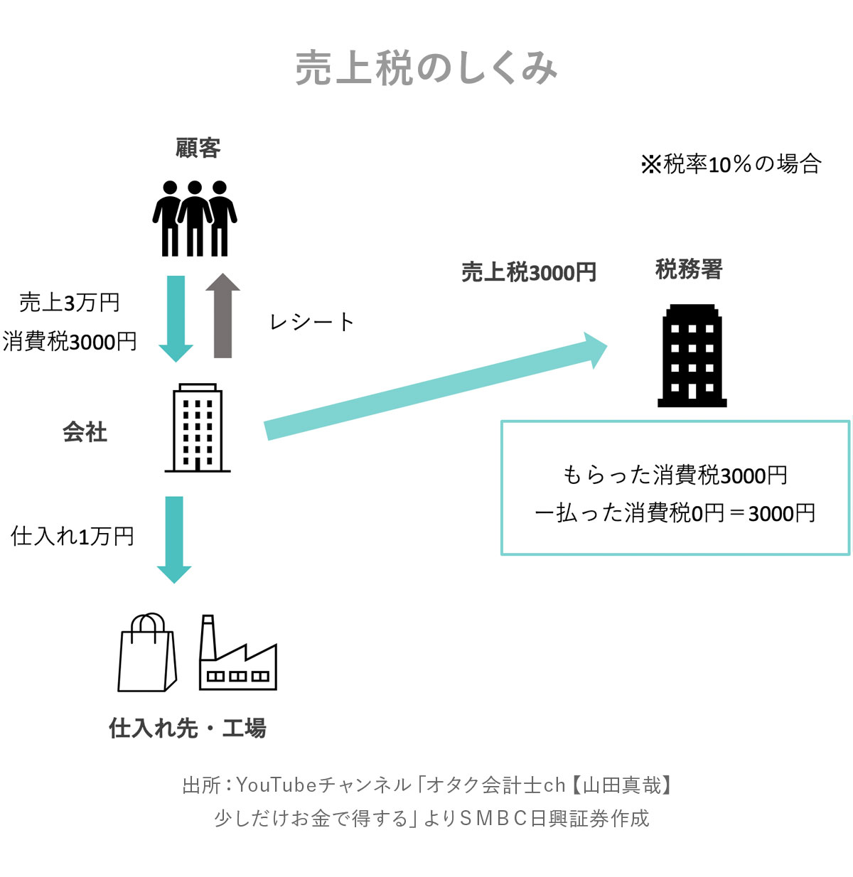 一方、売上税は仕入先には消費税を払いません。最終的な消費者である顧客に対してのみ売上税(10%)3000円足して売ります。そして、その3000円をそのまま国に納めます。