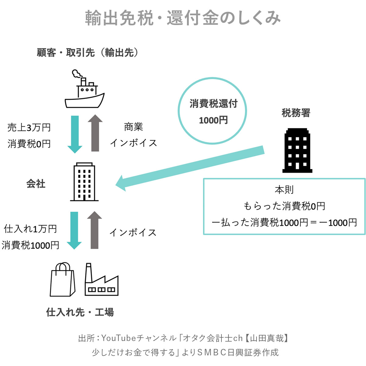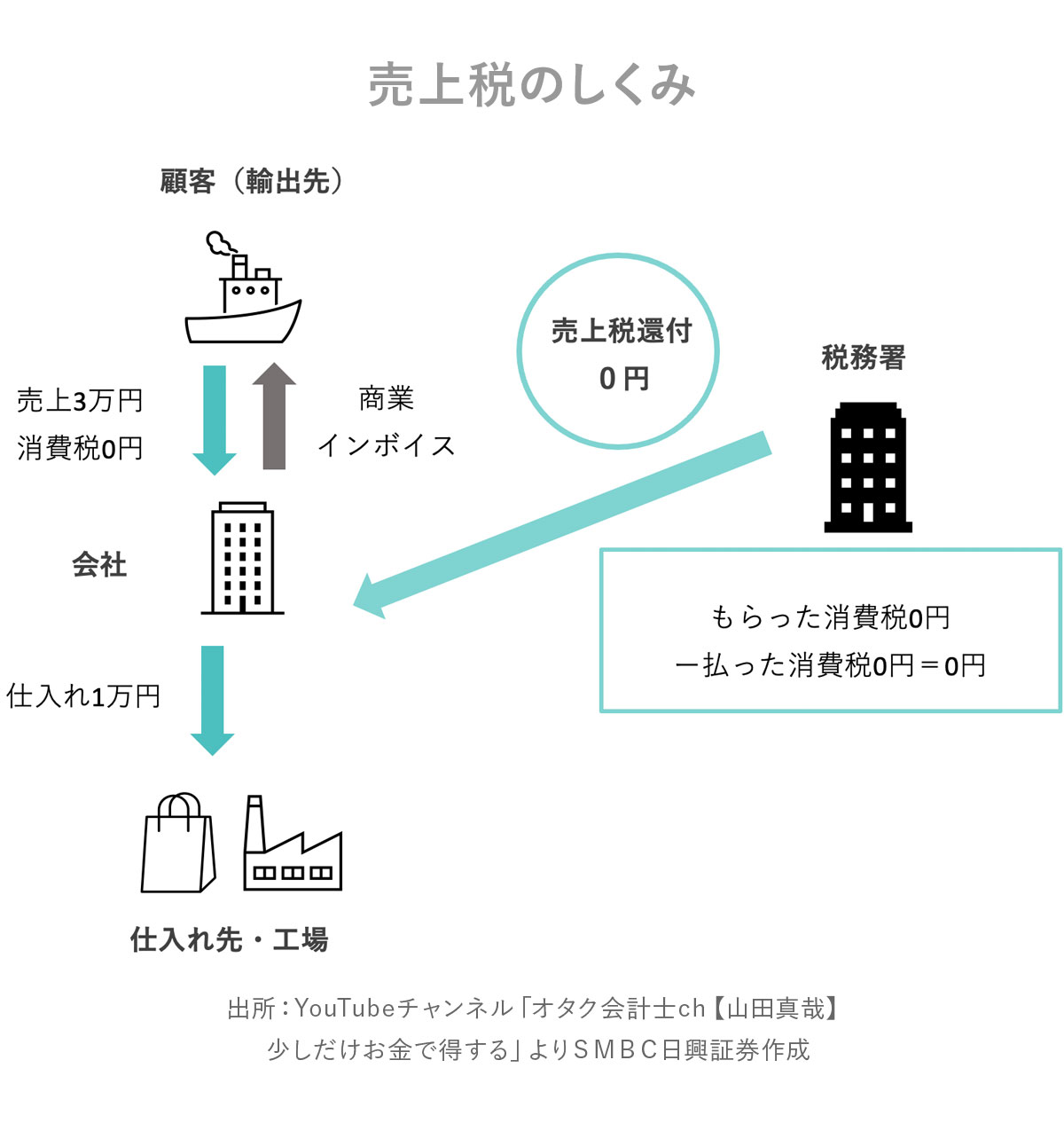 売上3万円の例を挙げましたが、これが2万円でも4万円でも消費税還付の額は変わりません。他の国内企業が消費税を負担する一方で、輸出企業は消費税の負担がないため、優位になります。