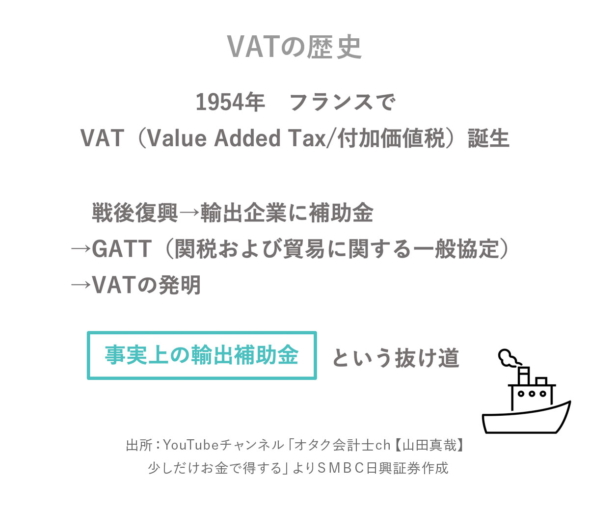 ここまで消費税・VATと売上税について見てきましたが、一番の違いは輸出の時に還付金があるかないかです。そんなVATを発明したのは1954年のフランスです。当時のフランスは第二次世界大戦でナチスドイツに占領され、復興を頑張らなければならない時期でした。国を立て直すために輸出産業を支えようと、輸出企業に多額の補助金を出していました。しかし、その後まもなくGATT(関税および貿易に関する一般協定)を世界各国と結ばなければならなくなります。その中に「輸出企業に補助金を出すのは貿易戦争になるからやめよう」という取り決めがあったのです。今までのように補助金は出せなくなって編み出されたのが、このVATなんです。