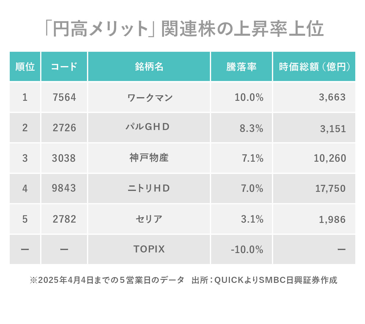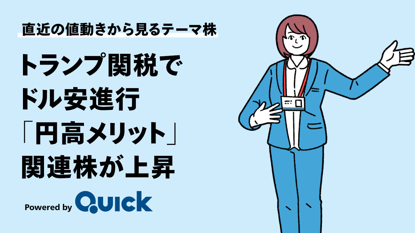 株式市場で「円高メリット」関連株が買われています。QUICKが選定する関連株の平均上昇率は2.4%となり、東証株価指数(TOPIX、10.0%安)に対して逆行高となりました(4月4日までの5営業日の騰落)。株価が上昇した5銘柄とその背景について解説します!