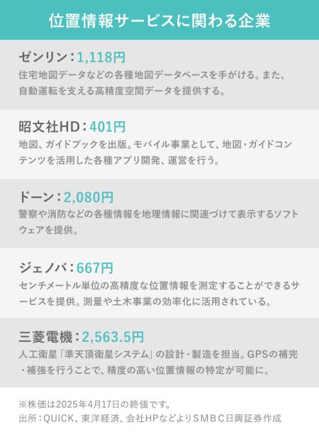 4月19日は「地図の日」。日本地図を初めて正確に作った伊能忠敬が、1800年(寛政12年)に、国土測量のために江戸を出発した日にちなんで制定されました。現在の地図情報や位置情報は、衛星からの電波を利用して、地球上の現在地を特定するGPS (Global Positioning System)が使われています。地図アプリやカーナビゲーションに加え、自動運転やドローンへとサービスが広がりつつあります。そこで今回は、位置情報サービスに関わる企業をご紹介します。
