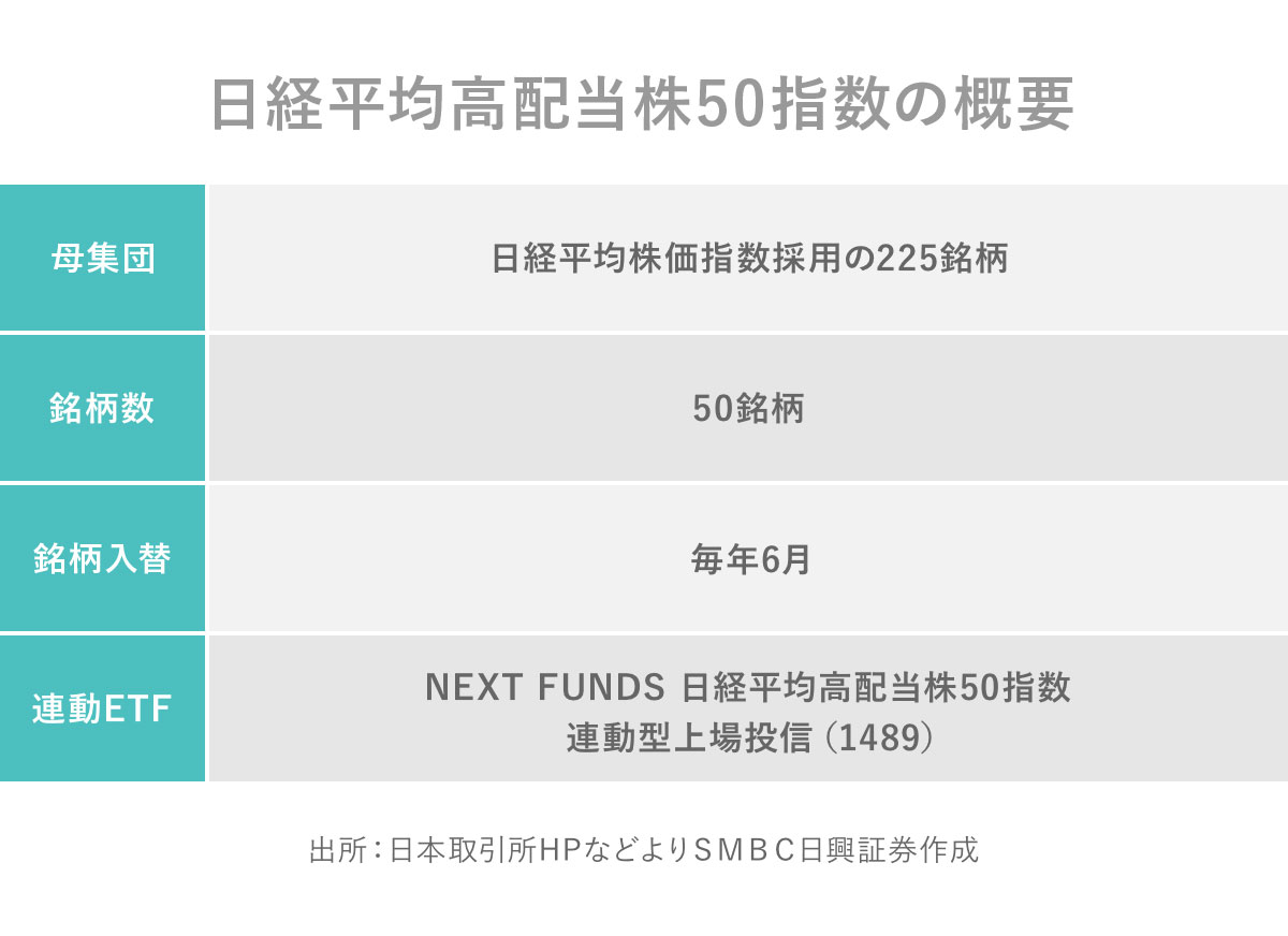 日経平均株価の構成銘柄を対象に、毎年5月の最終証券営業日を基準日とした場合の基準日時点の「予想配当利回りランキング」を次の1〜3の優先順位で、予想配当利回りが高い順から50銘柄を選定します。なお、予想配当利回りに用いられる予想配当は「日経会社情報」の予想です。予想配当利回りが同じになった場合は、直近1年間の1日あたり平均売買代金が高い方を優先するという「流動性重視」ルールがあります。