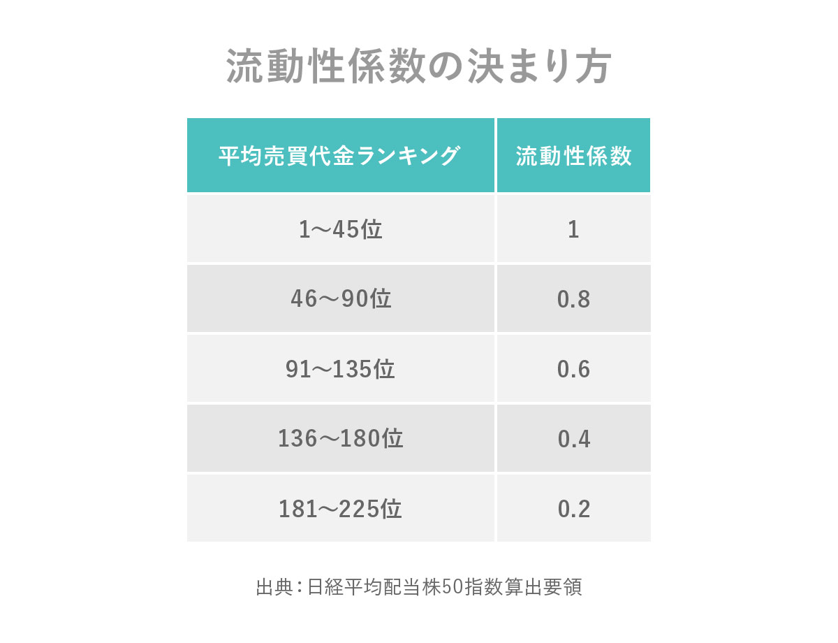 直近1年間の1日あたり平均売買代金をランキングし、順位によってそれぞれ以下の表に示した値が用いられます。つまるところ、平均売買代金が多ければ流動性係数が高くなります。なお、特定の銘柄のウエートが5%を超える場合は、5%以内に収まるようにウエート・ファクターが調整されます。