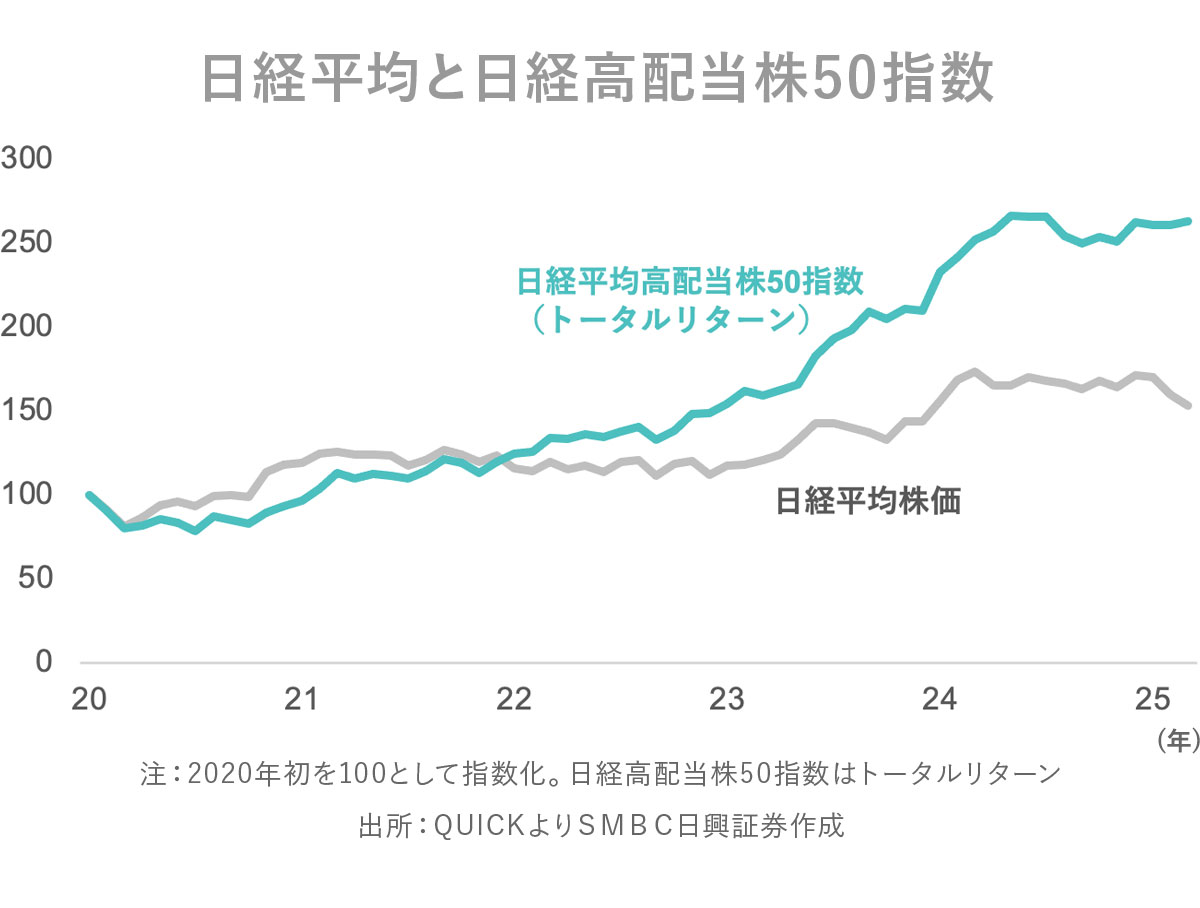 2022年の春を境にして、日経平均株価より優位に推移しています。この年の4月に東証の市場再編がありました。さらに、2023年3月には東証が上場企業に対して、資本コストや株価を意識した経営の実現に向けて改善を要請し、企業価値向上への取り組みを求めました。これらをきっかけに株主還元を強化する企業が相次ぎ、その一環として増配を実施した企業がたくさんありました。「日経平均高配当株50指数」が優位に推移し続けている理由の一つでしょう。