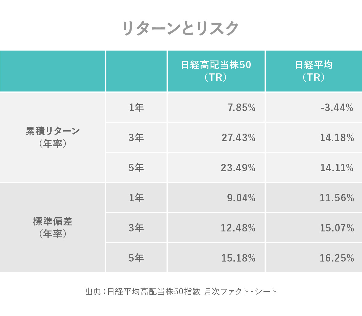 さらに、特筆すべきことがあります。日経平均株価と比較して高リターン・低リスクなのです。こちらの図の「標準偏差」がいわゆるリスクと呼ばれるもので、値動きの大きさとでも理解してください。その標準偏差が日経平均株価よりも低いことがわかります。一般的には高いリターンを求めるとリスクも高くなる傾向があります。そんな中、あくまでも相対的な比較ですがリターンが高く、リスクが低いのはうれしい株式指数です。