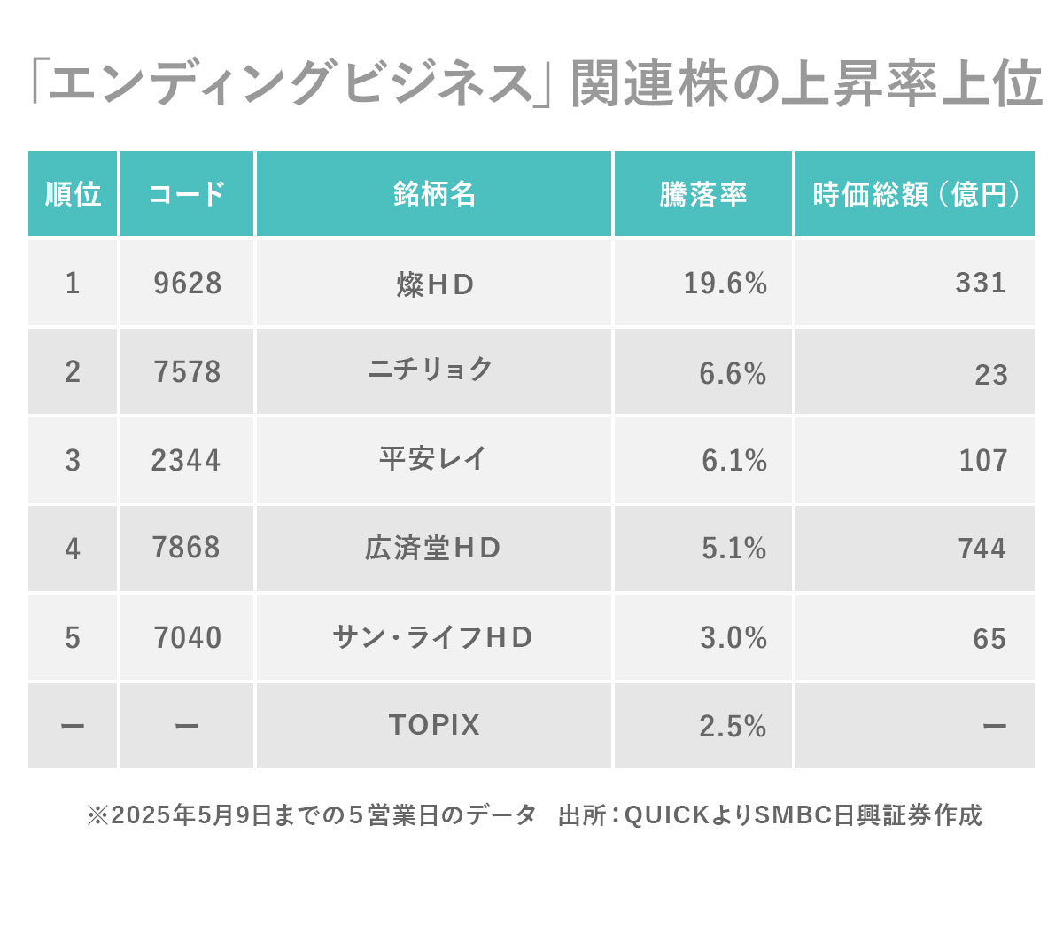 株式市場で「エンディングビジネス」(葬祭サービス)関連株が買われています。QUICKが選定する関連銘柄の平均上昇率は5.7%と、東証株価指数(TOPIX、2.5%)を上回りました(5月9日までの5営業日の騰落)。株価が上昇した5銘柄とその背景について解説します!