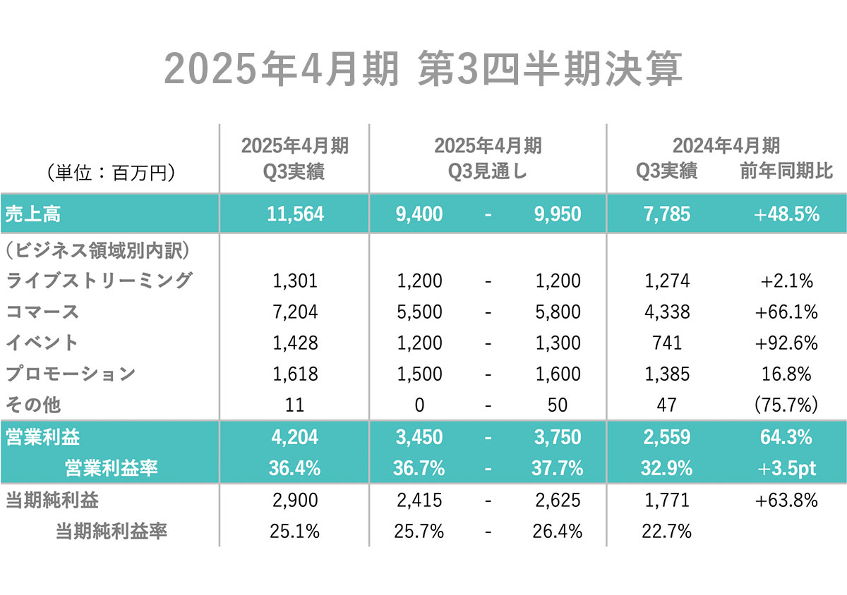 さらに、イベント売上も92.6%増と伸びていて、力を入れています。 音楽にも力を入れていますし(2025年4月期 第3四半期決算説明資料 P11参照)、ユニット化によってイベントの集客力向上も見込めますので今後はイベントの拡大も期待できそうです。