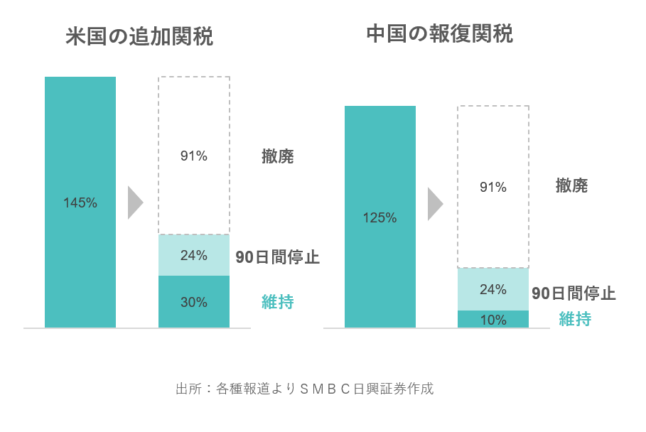 これにより、米中双方で91%の追加関税を撤廃、24%分を90日間停止することになりました。