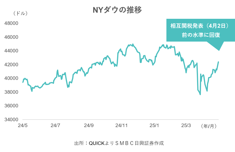 米中の行き過ぎた相互関税の回避により、5月12日の米国株式市場でNYダウは前営業日比1160ドル高の4万2410ドルで取引を終えました。これでトランプ米大統領が相互関税を発表する前の水準(4月2日終値4万2225ドル)を上回ったかたちとなりました。