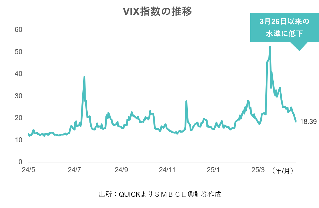 また、投資家の不安心理を表すとされるVIX指数も18.39ポイントと、3月26日以来の水準にまで低下。相互関税を巡る過度な不安については払しょくされたと言えそうです。