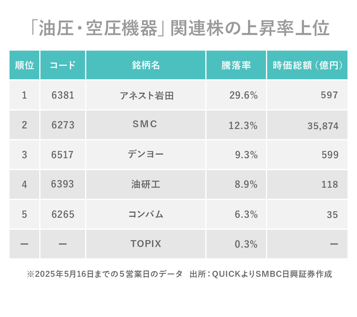 株式市場で「油圧・空圧機器」関連株が買われています。QUICKが選定する関連銘柄の平均上昇率は3.8%と、東証株価指数(TOPIX、0.3%高)を上回りました(5月16日までの5営業日の騰落)。株価が上昇した5銘柄とその背景について解説します!