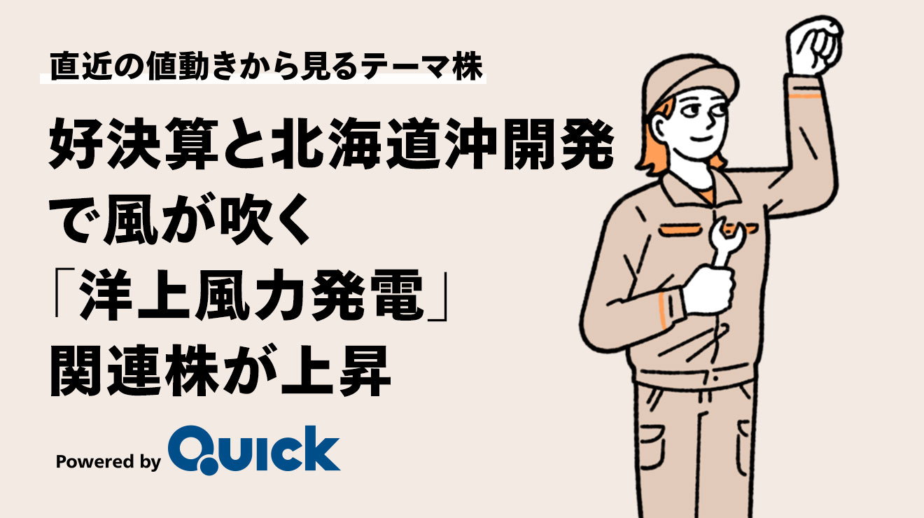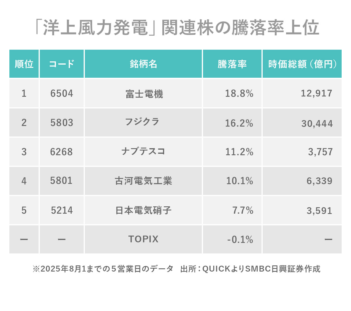 株式市場で「洋上風力発電」関連株が買われています。QUICKが選定する関連株の平均上昇率は3.1%と、東証株価指数(TOPIX、0.1%安)に対して逆行高となりました(8月1日までの5営業日の騰落)。株価が上昇した5銘柄とその背景について解説します!