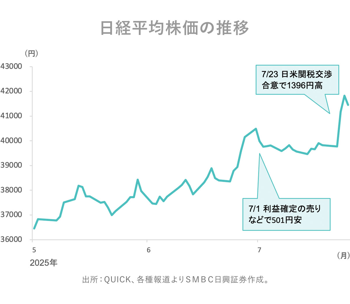 7月の日本株市場は、月中こそ小動きでしたが、月末には日米関税交渉の決着をきっかけとして大幅に上昇しました。株式市場の最大の不透明要因だった関税交渉が一段落したことから、それに伴う下値不安は後退したと言えるでしょう。8月は、米国のEUや中国との関税交渉、企業の決算発表、参院選後の政権枠組みの行方などが注目ポイントとなりそうです。