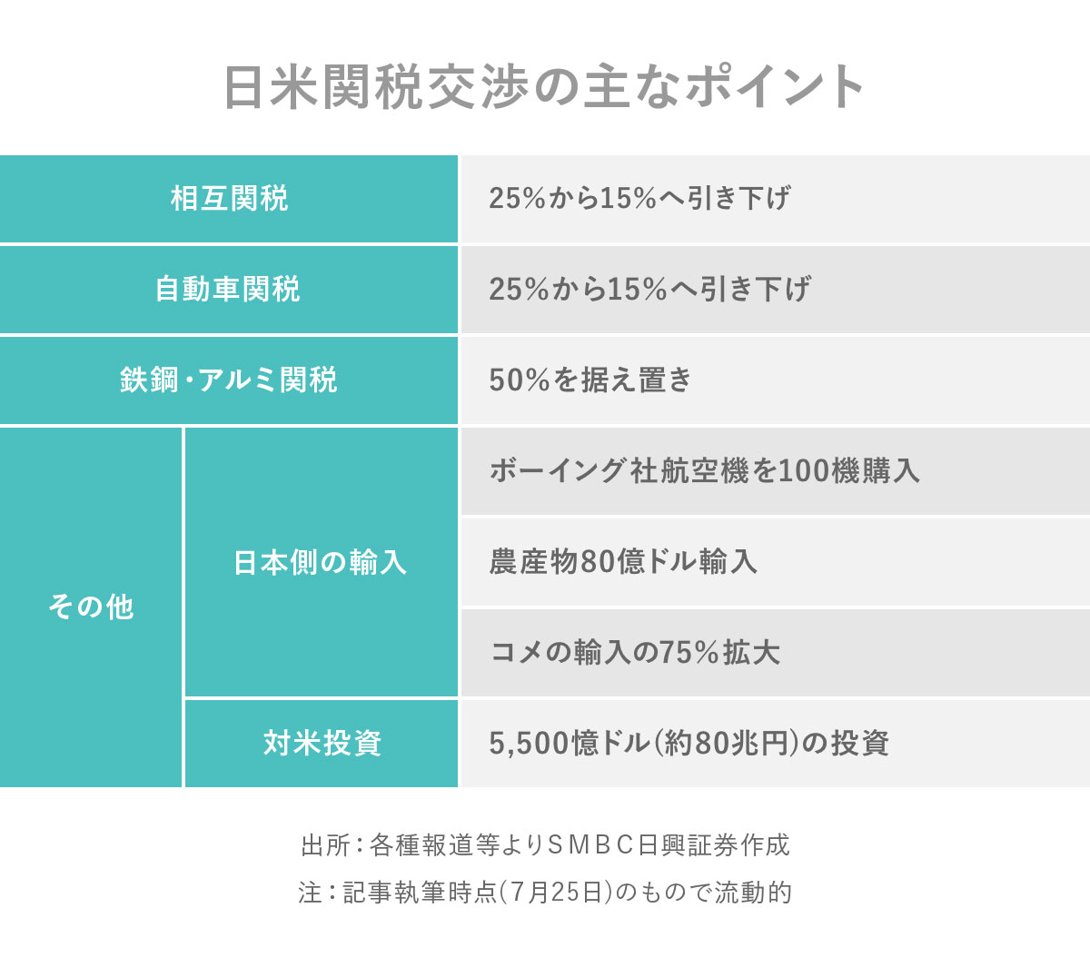 日本にとっては、ある程度の譲歩をしたものの、最悪の事態は回避され比較的マイルドな着地点に落ち着いたことから一定の成果を得られたと言えそうです。マクロ経済的にも、関税の設定はGDP成長率を若干押し下げるものの、軽微なものにとどまり経済は拡大する見通しです。