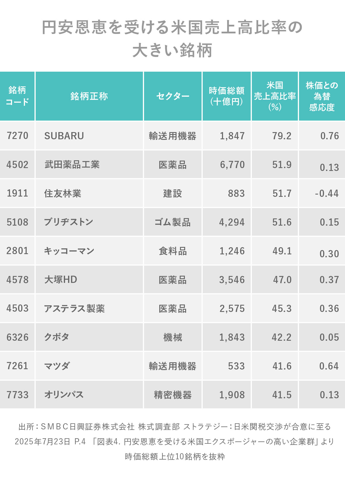 悲観的に過度に織り込んでいた米国売上高に対する関税のマイナス影響は想定を下回る可能性があり、また、円安局面で株価がプラスに反応する銘柄として注目してみてはいかがでしょうか。