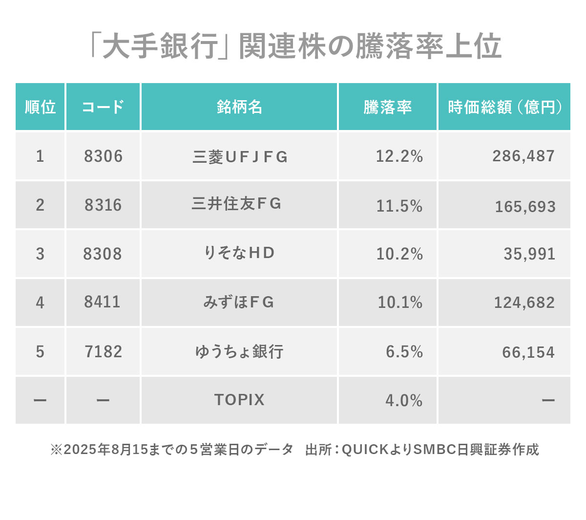 株式市場で「大手銀行」関連株が買われています。QUICKが選定する関連株の平均上昇率は9.3%と、東証株価指数(TOPIX、4.0%高)を上回りました(8月15日までの5営業日の騰落)。株価が上昇した5銘柄とその背景について解説します!