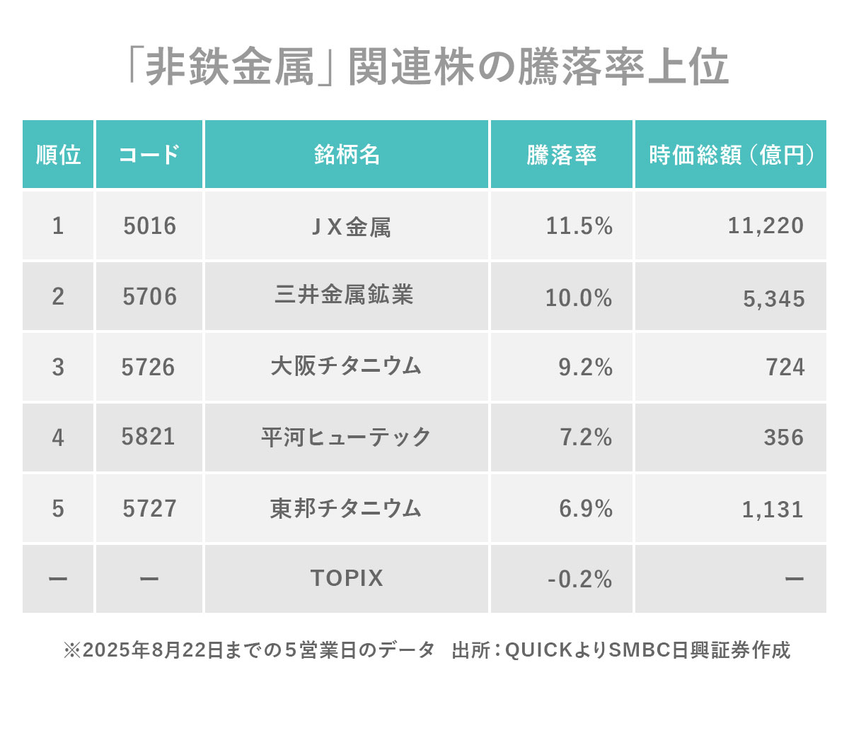 株式市場で「非鉄金属」関連株が買われています。QUICKが選定する関連株の平均上昇率は2.8%と、東証株価指数(TOPIX、0.2%安)に対して逆行高となりました(8月22日までの5営業日の騰落)。株価が上昇した5銘柄とその背景について解説します!