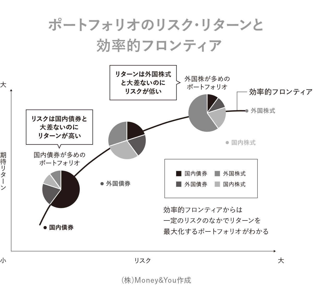 期待リターン・リスク・相関係数の異なる資産を組み合わせたさまざまなポートフォリオを作ると、「同じリターンでリスクが最も小さい」資産配分や、「同じリスクで最もリターンが高い」資産配分の組み合わせができることがわかりました。このポートフォリオをつないだ線を「効率的フロンティア」といいます。