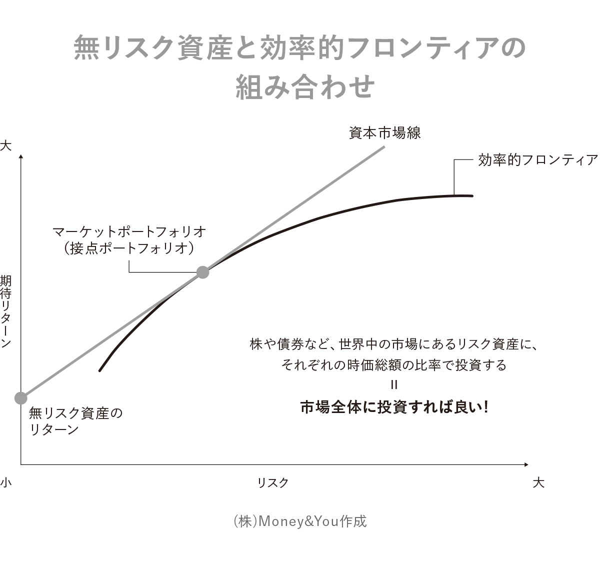 無リスク資産はリスクがないので、期待リターンはグラフの縦軸上にプロットされます。この点から、リスク資産の効率的フロンティアに向かって直線を引いたときの接点を「マーケットポートフォリオ(接点ポートフォリオ)」といいます。また、無リスク資産の期待リターンとマーケットポートフォリオの2点を通る直線を「資本市場線」といいます。
