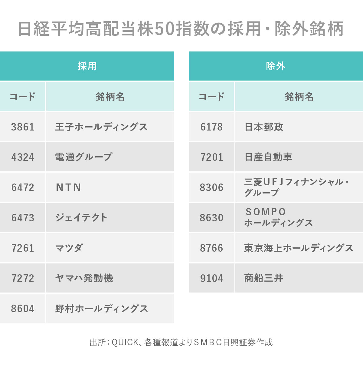 」が除外され、併せて日経平均高配当株50指数からも除外されたためです。「原則として構成銘柄が45銘柄未満となるまではその都度補充はせず、次の定期見直しで50銘柄に戻す」というルールに基づき、補充は次回の定期入れ替え時に実施することが発表されていたという背景があります。
