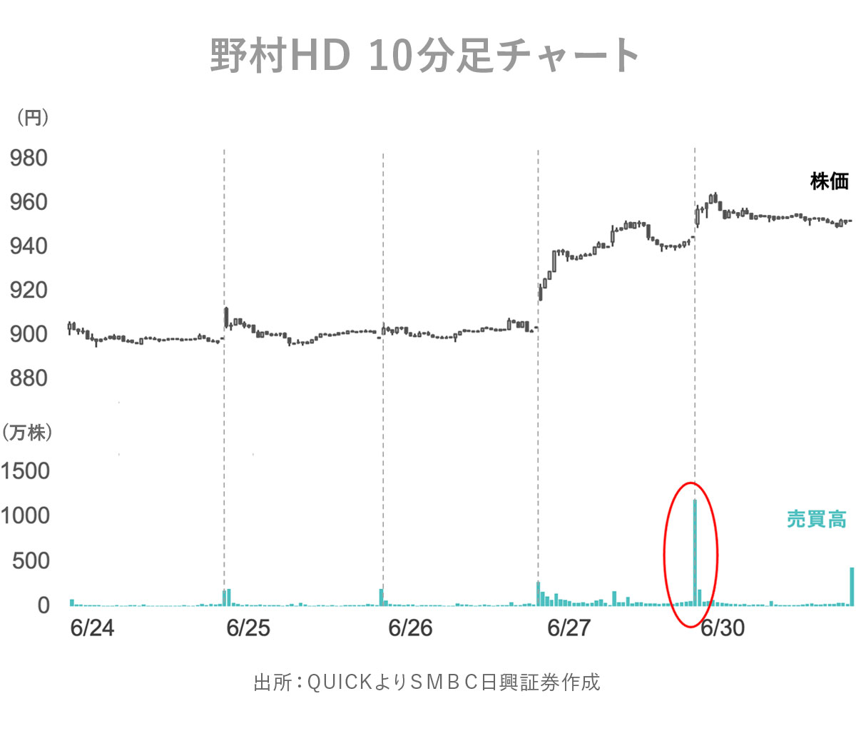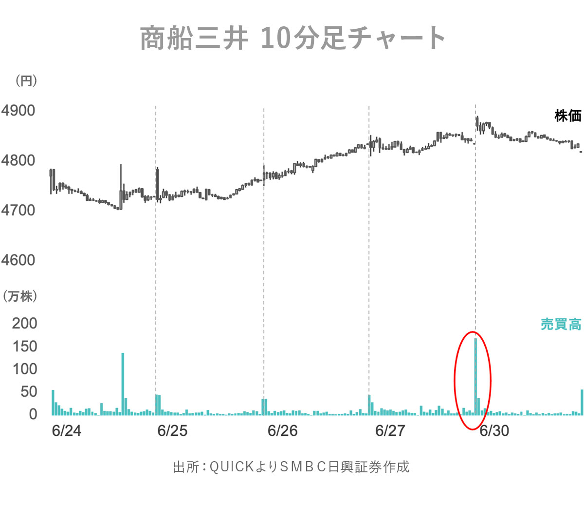除外された商船三井は、採用された野村HDとは異なり、6月27日の前場が前日比で軟調でした。後場は上昇しましたが、引けは出来高を伴って株価が下げています。