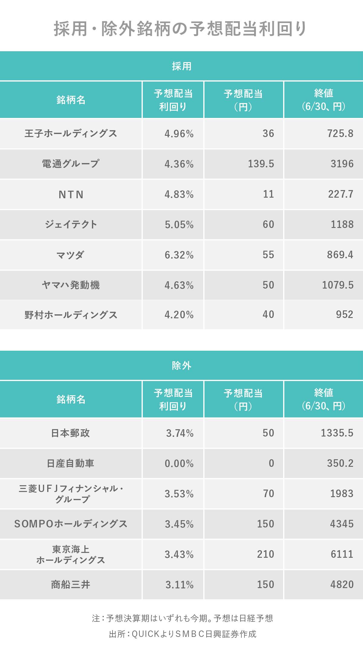 個人的な印象で恐縮ですが、6月13日に日経平均高配当株50指数の銘柄定期入れ替えが発表されたときやや意外に感じました。この株式指数の採用銘柄は5月末の予想配当利回りランキングで決まります。前年度比で減配を発表した商船三井や無配予想を出した日産自動車が除外されたことは合点がいったのですが、本決算で前年度比増配を発表した三菱UFJフィナンシャル・グループ、SOMPOホールディングス、東京海上HDが除外されたことが意外に思えたのです。