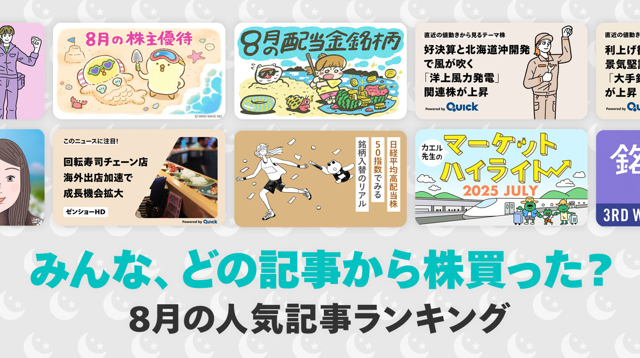 8月に買われた記事では、「累進配当や配当の下限値設定にも注目 8月の配当金銘柄6選」が1位にランクイン。2位は「日経平均高配当株50指数でみる銘柄入替のリアル」、3位は「カレーにとんかつ、アイスがもらえる! 8月の優待7選」がランクインしました。