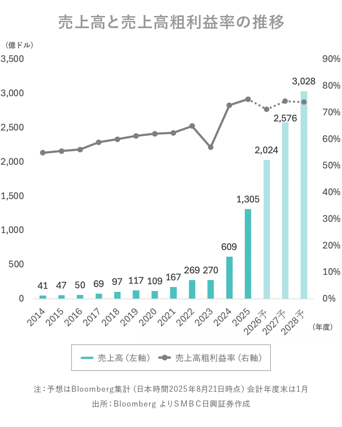 売上高は2024年頃から飛躍的に伸びていて、今後も大きく上昇することが予想されています(予想はBloomberg集計)。