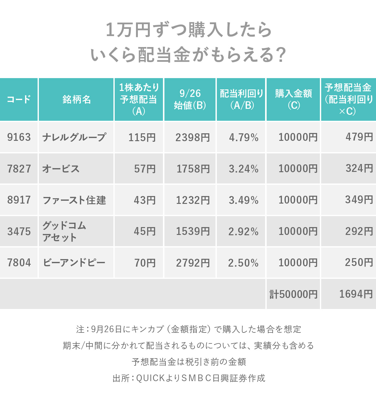 ※決算期が10月の上場株式のうち、配当利回りが2.5%以上(9/22終値時点)あり、営業利益が減益予想でない銘柄を選定