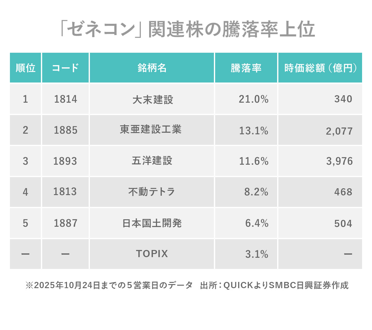 株式市場で「ゼネコン」関連株が買われています。QUICKが選定する関連銘柄の平均上昇率は4.7%と、東証株価指数(TOPIX、3.1%高)を上回りました(10月24日までの5営業日の騰落)。株価が上昇した5銘柄とその背景について解説します!