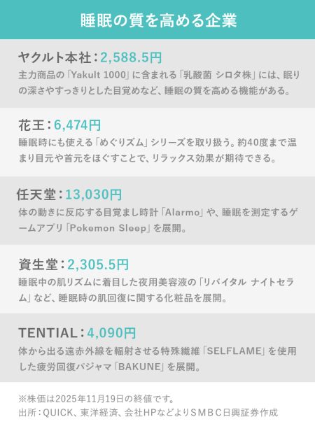 11月23日は「勤労感謝の日」です。働く皆さん、睡眠をしっかりとって、休めていますか?厚生労働省の調査によると、働く世代で「睡眠で休養が取れていない」と感じている人は、約3割もいるようです。実際に、睡眠時間が6時間未満の人は、30~50代男性、40~60代女性で4割以上を占めているという結果が出ています。今回はそんな忙しかったり何らかの理由で眠れない方に向けて睡眠の質を高める企業をご紹介します。睡眠の質を高める企業: ヤクルト本社花王任天堂資生堂TENTIAL