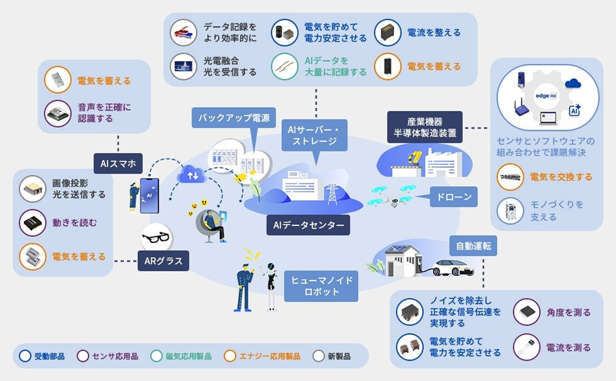 TDKの技術は、生成AIに不可欠なデータセンター内のAIサーバーやストレージに加え、ARグラス、スマートフォン、自動運転車など、さまざまなデバイスに活用されています。これらを含む広範な市場を、TDKでは「AIエコシステム市場」と位置づけています。AIがさらに普及・活用されるには、いくつかの技術的な課題を乗り越える必要がありますが、TDKは、そうした課題に向き合い、解決につながるデバイスやシステムの開発を通じて「AIエコシステム」の成長を支えています。
