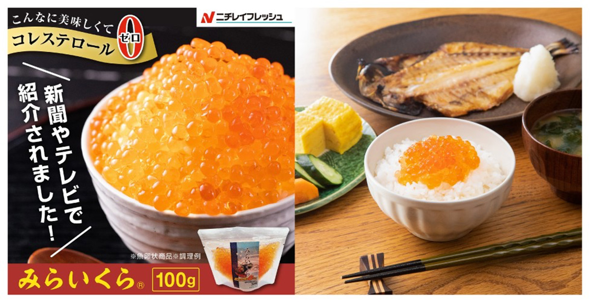 ニチレイは数々のロングセラーに加え、健康を意識した食品の研究開発にも取り組んでいます。「みらいくら®」は、コレステロールフリーかつ魚卵アレルゲンフリーを実現した魚卵状の人工いくらです。同商品は天然いくらとは異なり、コレステロールや魚卵アレルギーの原因物質を含まず、動物性原料も使用していません。このため、コレステロールの多い食べ物を控えている高脂血症の方や、魚卵アレルギーの方、ヴィーガン志向の方も楽しむことができます。独自の調味液で味付けし、おいしさにもこだわっています。