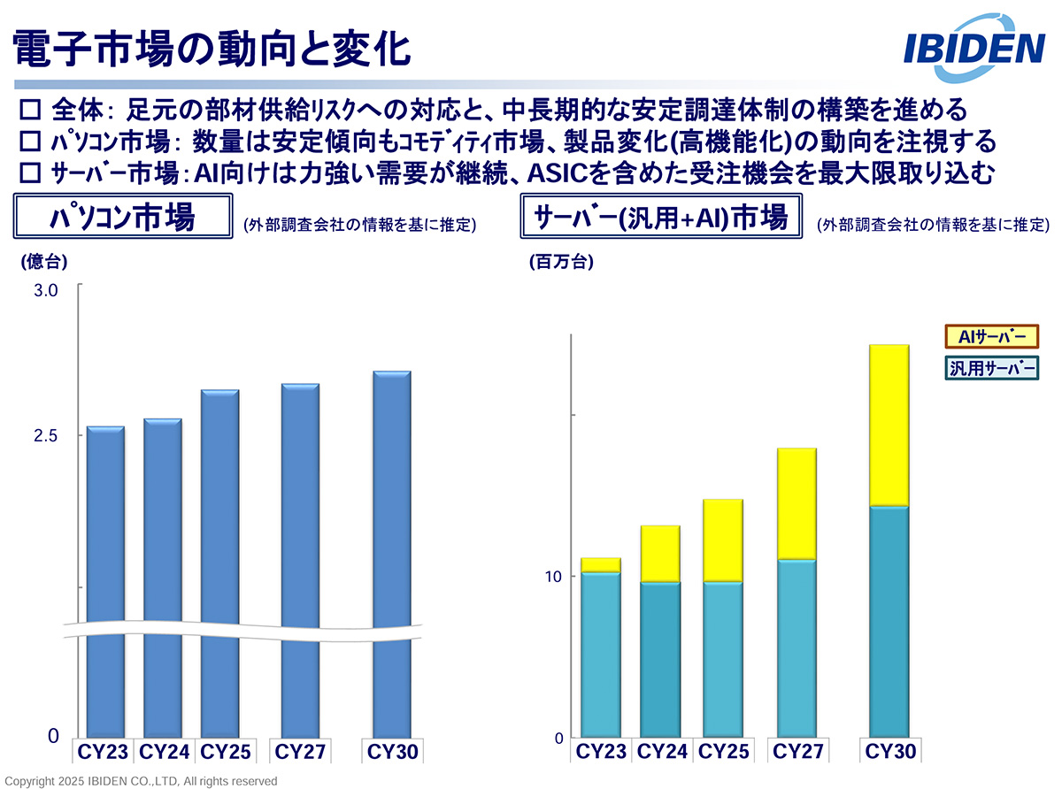 とはいえ、2025年10月にはAIサーバー向けをはじめとする最先端の製品を生産する大野工場の稼働など、新工場建設も進み、既存工場においてもAIサーバー比率を高める対応を取り、生産能力増強に動いています(2025年度第2四半期決算説明会資料 P11、12参照)。