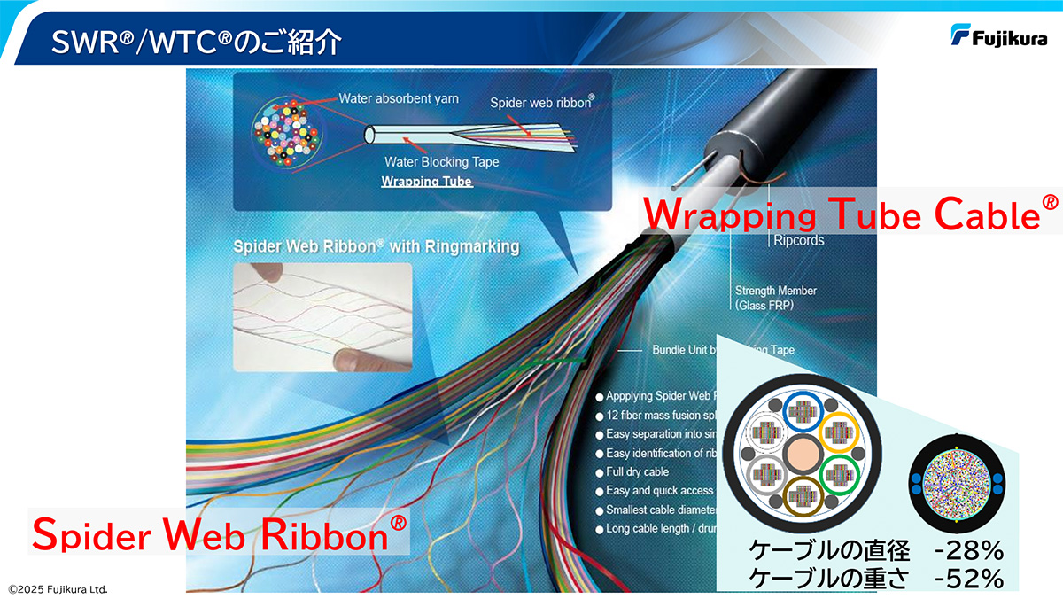 情報通信事業における戦略的製品の一つ、光ファイバケーブルSpider Web Ribbon/Wrapping Tube Cable(SWR®/WTC®)は細径・高密度・軽量という特長を兼ね備えた光ファイバケーブルです。昨今、生成AIの普及・拡大を背景に、AIデータセンタへの投資が拡大しています。中でも、AIサーバの増加やネットワークの高速化により、データセンタ内の光ファイバ量が急激に増加しています。このため、省スペースに貢献する同社の光ファイバケーブルは需要が拡大しています(統合報告書2025 P43、44参照)。