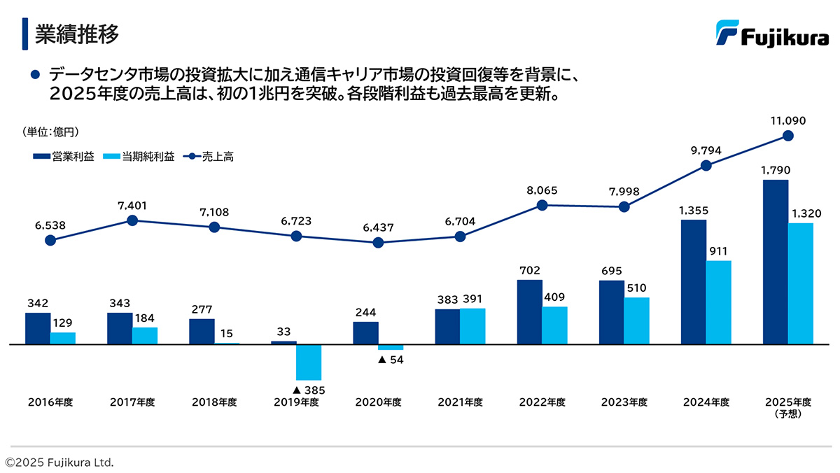実際にフジクラとしても、情報通信事業部門の好調が続くことで、2026年3月期の通期予想では、増収増益が続くことを見込んでいます(2025年度第2四半期決算資料 P16、17参照)。