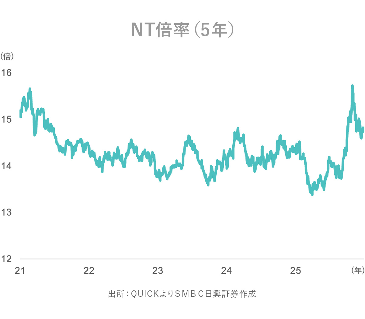 日経平均株価の方がTOPIXよりケタが大きいですから、10以上の値になることがほとんどです。2025年8月以降の推移をみると、10月末の15.73倍をピークに緩やかに下落しています。10月末は日経平均株価が52,411.34円という史上最高値をつけた日でした。実はTであるTOPIXもこの日史上最高値で終わっているのですが、Nである日経平均株価の上昇も大きく、NT倍率が高くなったというわかりやすい結果です。