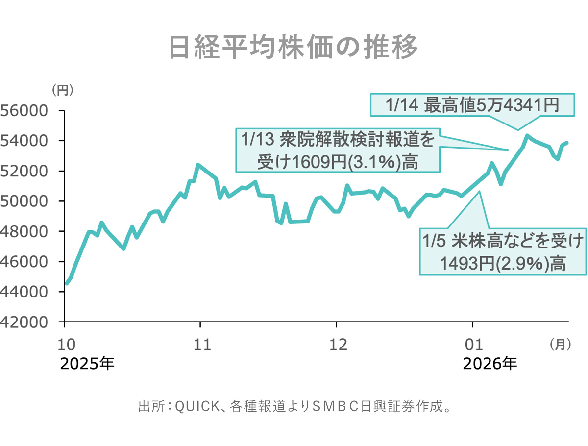 13日には、高市首相が衆議院の解散を検討しているとの報道を受け、政権の安定と政策の推進に対する期待が高まり日経平均は1609円(3.1%)上昇し、5万3000円台へ、翌14日もその勢いは続き5万4341円と連日で最高値を更新しました。