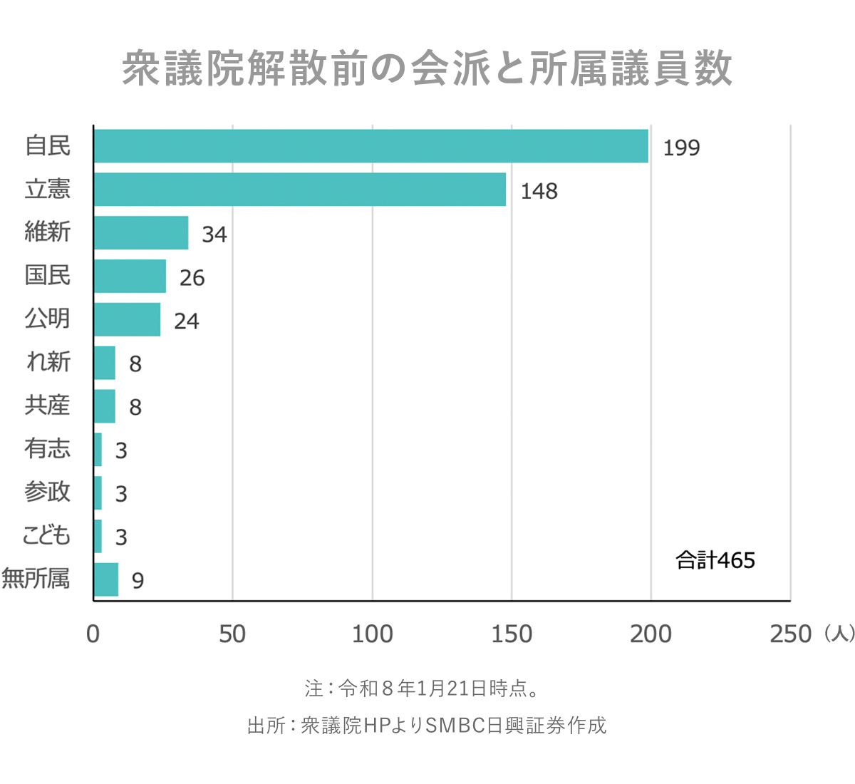 選挙では、小選挙区289、比例代表176の合計465議席が争われます。高市首相は選挙の勝敗ラインを、自由民主党と日本維新の会の獲得議席が過半数となる233議席を掲げる一方、立憲民主党と公明党は選挙協力で新党を結成するなど合従連衡の動きが活発となっています。