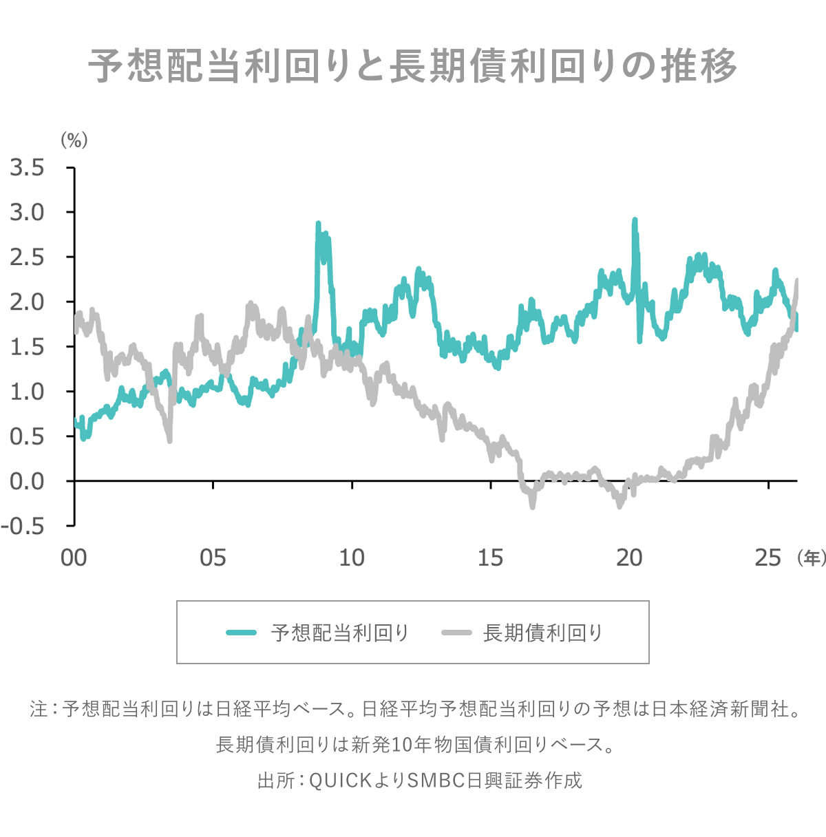 予想配当利回りが長期債利回りを上回っている状況は、株式の魅力が意識される局面でした。その局面に変化が進む中、配当利回りだけにとどまらない、新たな日本株の魅力にスポットライトが当たりそうです。
