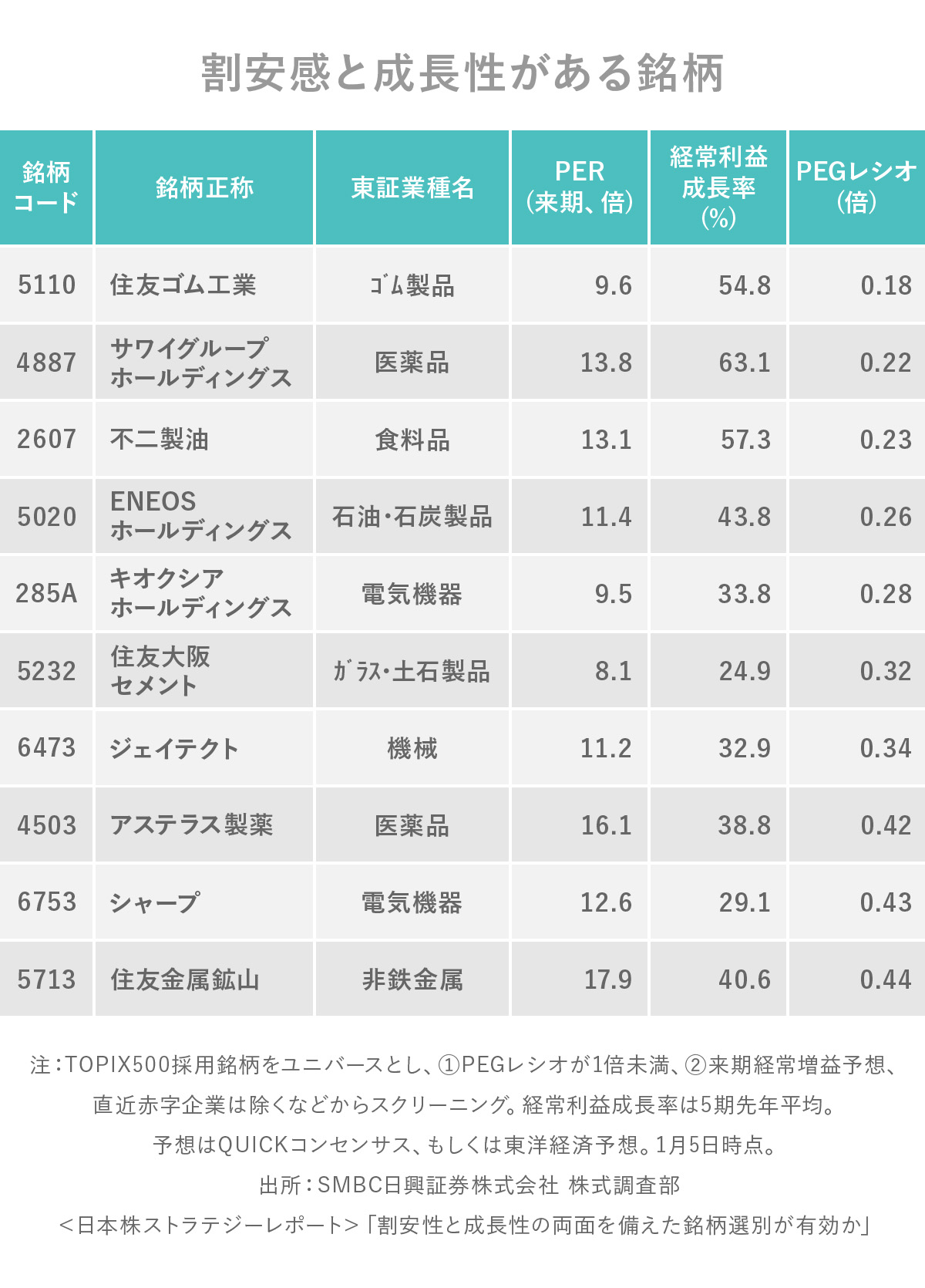 そこで、成長率に対して株価が過度に割高ではないかを見極める視点から、[予想PER÷経常利益成長率]で算出される「PEGレシオ」という切り口から銘柄を抽出しました。